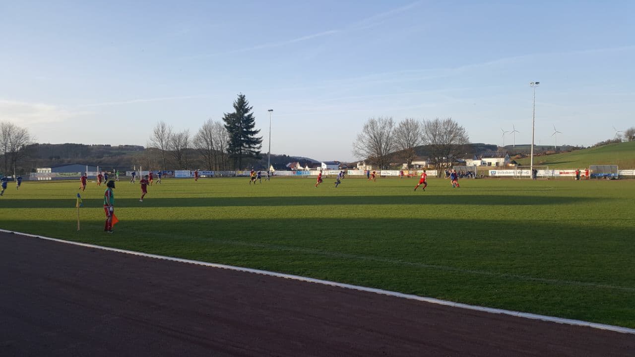 Zwar konnte man einen spielerischen Vorteil auf Seiten der SG bereits nach wenigen Minuten erkennen, die besseren (Halb-)Chancen hatte indes Kyllburg. Eine der wenigen gelungenen Offensivaktionen der SG hatte es allerdings in sich: nach etwa 20 Minuten setzte sich der aufgerückte Fabian Molitor zunächst über die linke Seite durch, entschied sich dann – auch mangels Abspielmöglichkeiten – zu einem temporeichen Solo-Lauf ins Zentrum. Sein Abschluss, etwa 15 Meter vor dem Tor aus halbrechter Position, landete am Aluminium und wäre sicherlich ein Tor wert gewesen. Stattdessen plätscherte das Spiel in der Folge vor sich hin. Mittelmäßiges Tempo, wenige Zweikämpfe und nahezu sommerliche Temperaturen erinnerten an ein Sportfestspiel mit wenig Unterhaltungswert. Nach einem unnötigen Ballverlust im Aufbauspiel kam die SG Badem binnen kurzer Zeit zu zwei Standardsituationen. Ein zu kurz und mittig abgelenkter Abwehrversuch landete vor den Füßen eines Bademer Spielers. Dieser fackelte nicht lange und drosch den Ball – ohne Gegnerdruck – aus 16 Metern in die Maschen.